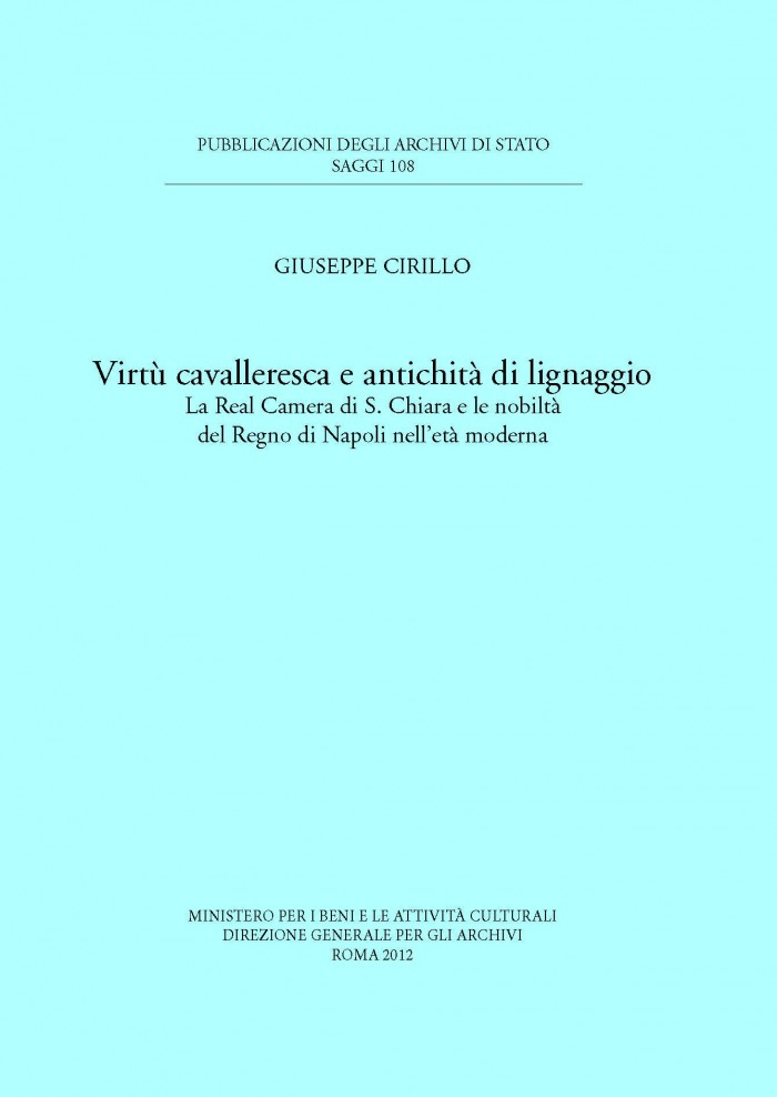 Disponibile online: Giuseppe Cirillo, Virtù cavalleresca e antichità di lignaggio. La Real Camera di S. Chiara e le nobiltà del Regno di Napoli nell’età moderna, Roma, 2012