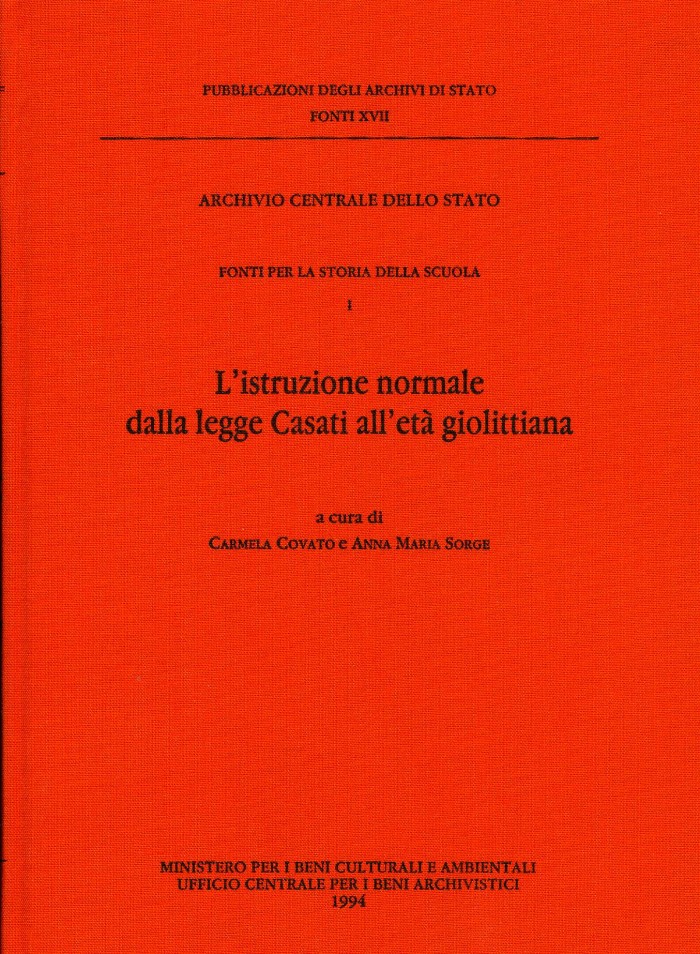 Disponibile online: Fonti per la storia della scuola. I. L'istruzione normale dalla legge Casati all'età giolittiana, a cura di Carmela Covato, Anna Maria Sorge, 1994
