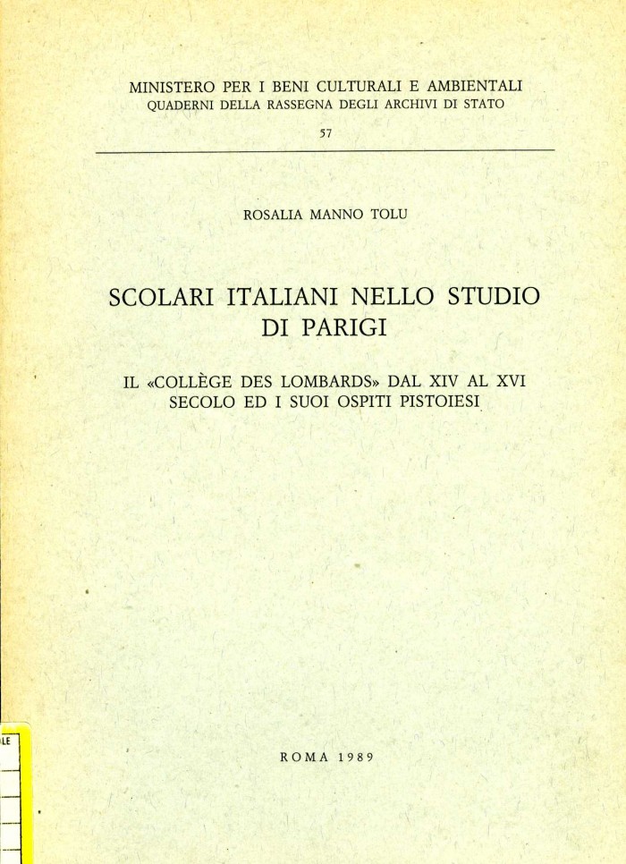 Scolari italiani nello Studio di Parigi. Il "Collège des Lombards" dal XIV al XVI secolo ed i suoi ospiti pistoiesi, Roma, 1989