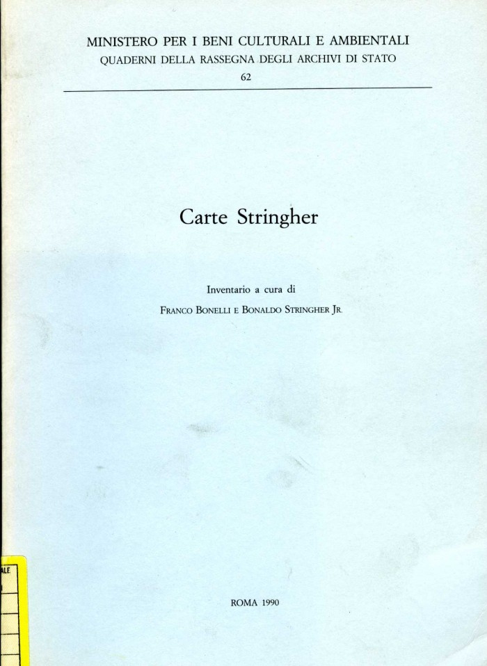 Disponibile online: Carte Stringher. Inventario, a cura di Franco Bonelli, Bonaldo Stringher jr, Roma, 1990