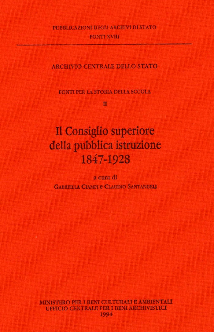 Disponibile online: Fonti per la storia della scuola II. Il Consiglio superiore della pubblica istruzione, 1847-1928, Roma 1994