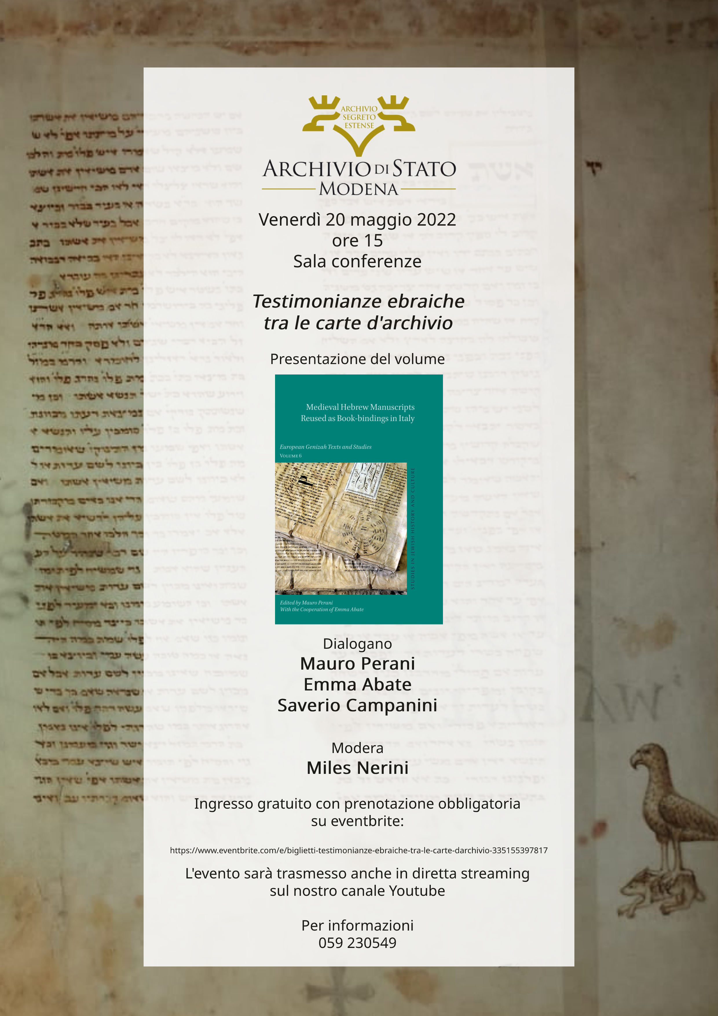 A Modena, venerdì 20 maggio, con inizio alle ore 15, nella Sala Conferenze dell'Archivio di Stato, si tiene la manifestazione Testimonianze ebraiche tra le carte d'archivio, con la presentazione del volume Medieval Hebrew Manuscripts Reused as Book-bindings in Italy, a cura di Mauro Perani, con la collaborazione di Emma Abate (European Genizah Texts and Studies, Volume 6, Leiden, Brill, 2022).